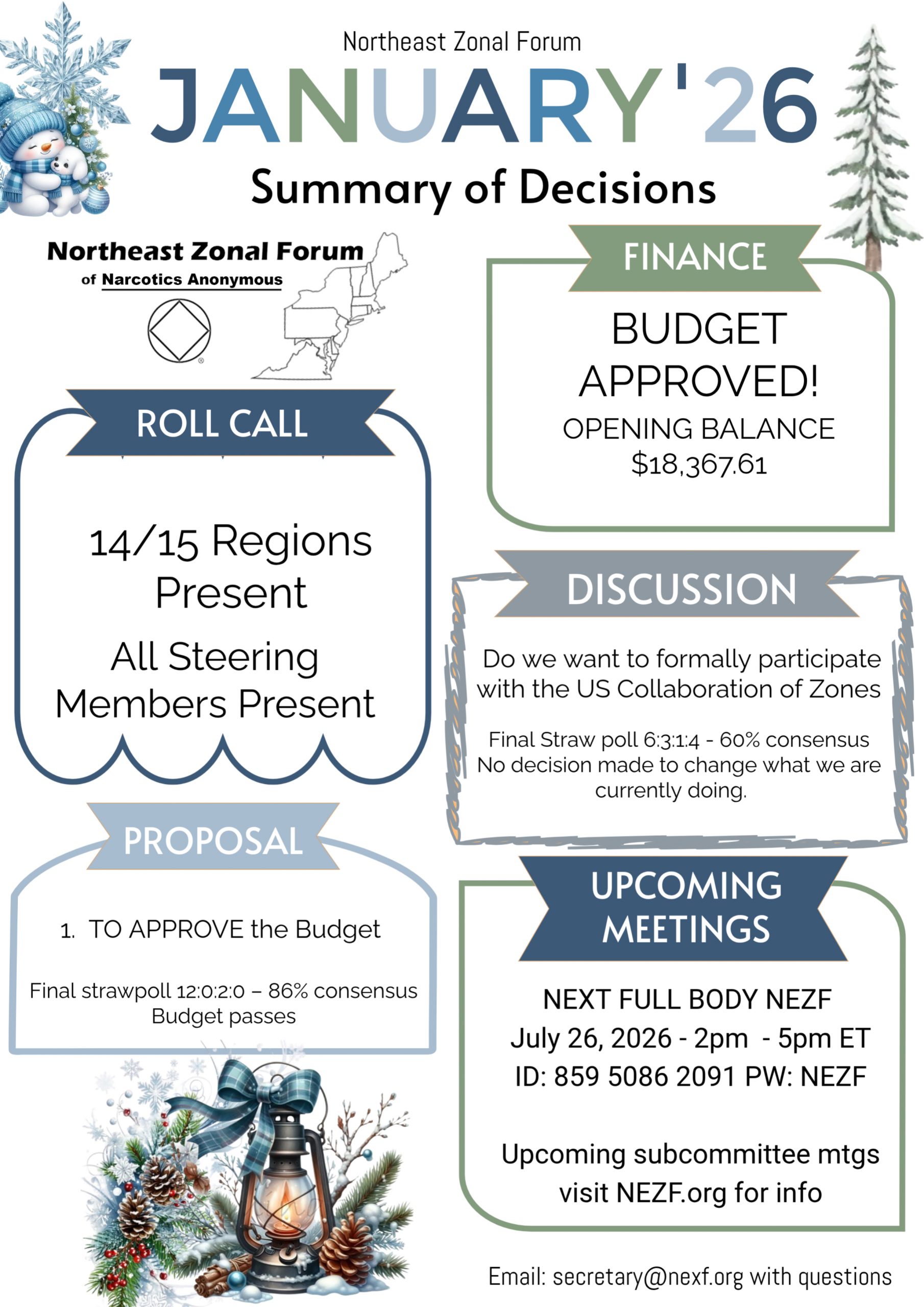 RSC 236th RSC Minutes Post author:rschellenberg Post published:February 26, 2026 Post category:Minutes 237th Regional Service Conference AgendaDownload 2026 budgetDownload CARNA update policyDownload CARNA updated addendumDownload Motion 235-2Download CARNA TREASURY REPORT DECEMBER 2025 (1)Download CARNA TREASURY REPORT DECEMBER 2025 (1)Download Dec RSC minutesDownload GTFNA flier 2Download GTFNA flierDownload RANA Holiday Marathon MeetingDownload RANA Holiday Marathon MeetingDownload NEZF SOD – 126Download RANA Jammie Jams Event FlyerDownload You Might Also Like 215th RSC Minutes September 17, 2022 237nd/rd/th RSC Minutes February 26, 2026 197th RSC Minutes June 15, 2019